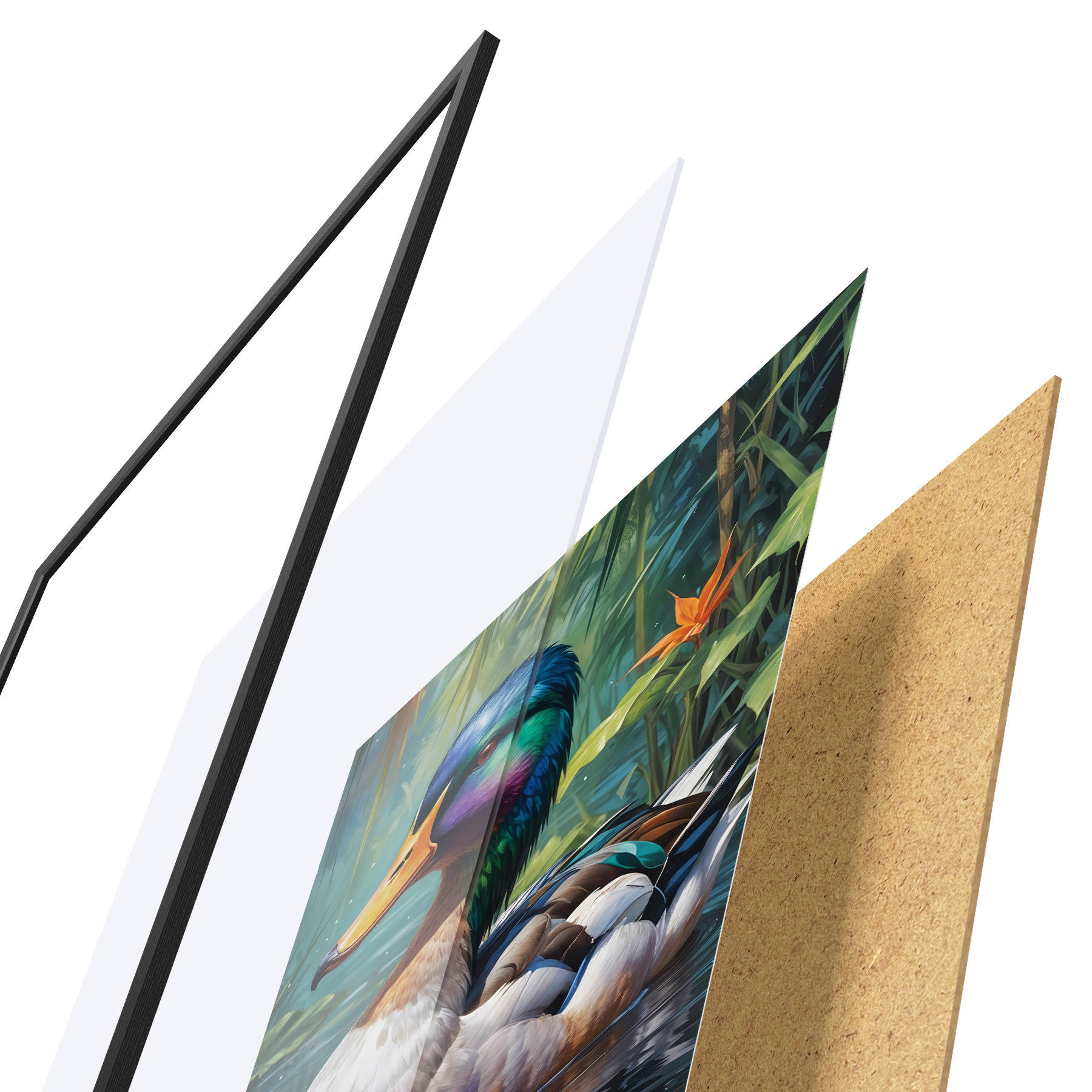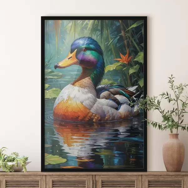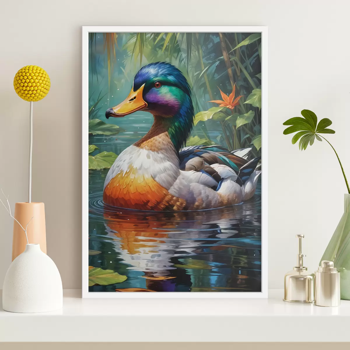Poster Värviline isane mandariinipart ujumas lopsakate roheliste lehtede ja langenud sügislehtedega tiigis Nr f40594