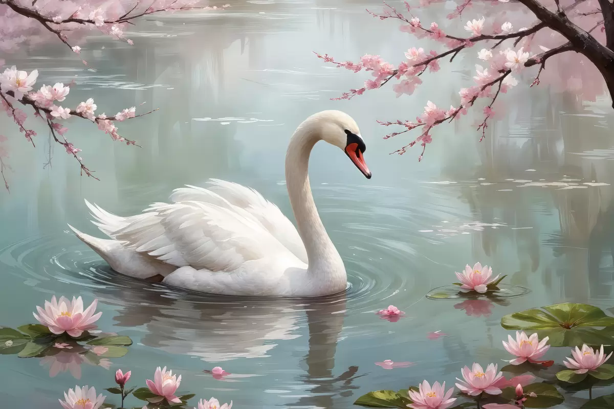 Poster Graatsiline valge luik ujub rahulikus tiigis, mida ümbritsevad õitsvad roosad kirsiõiepuud Nr f40597