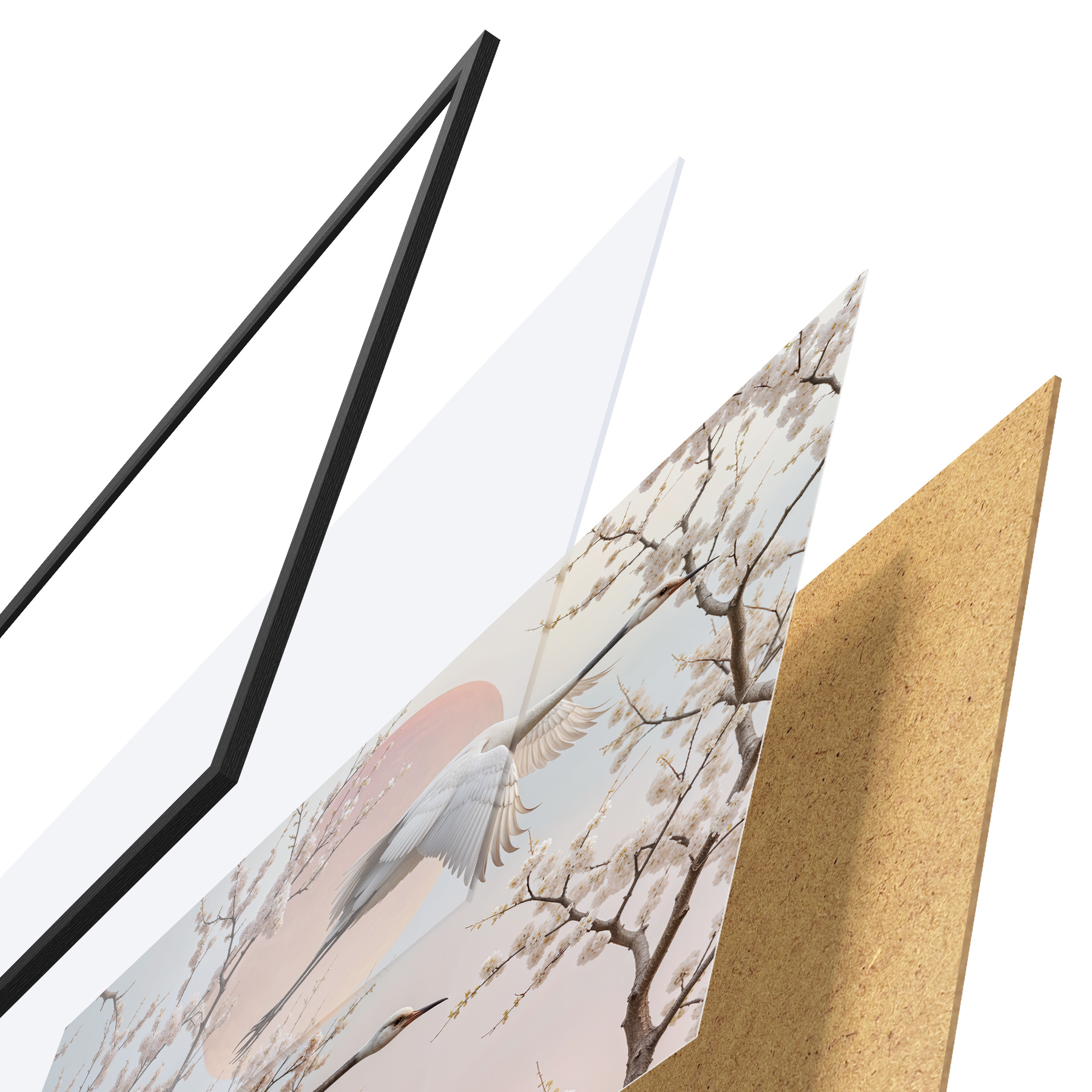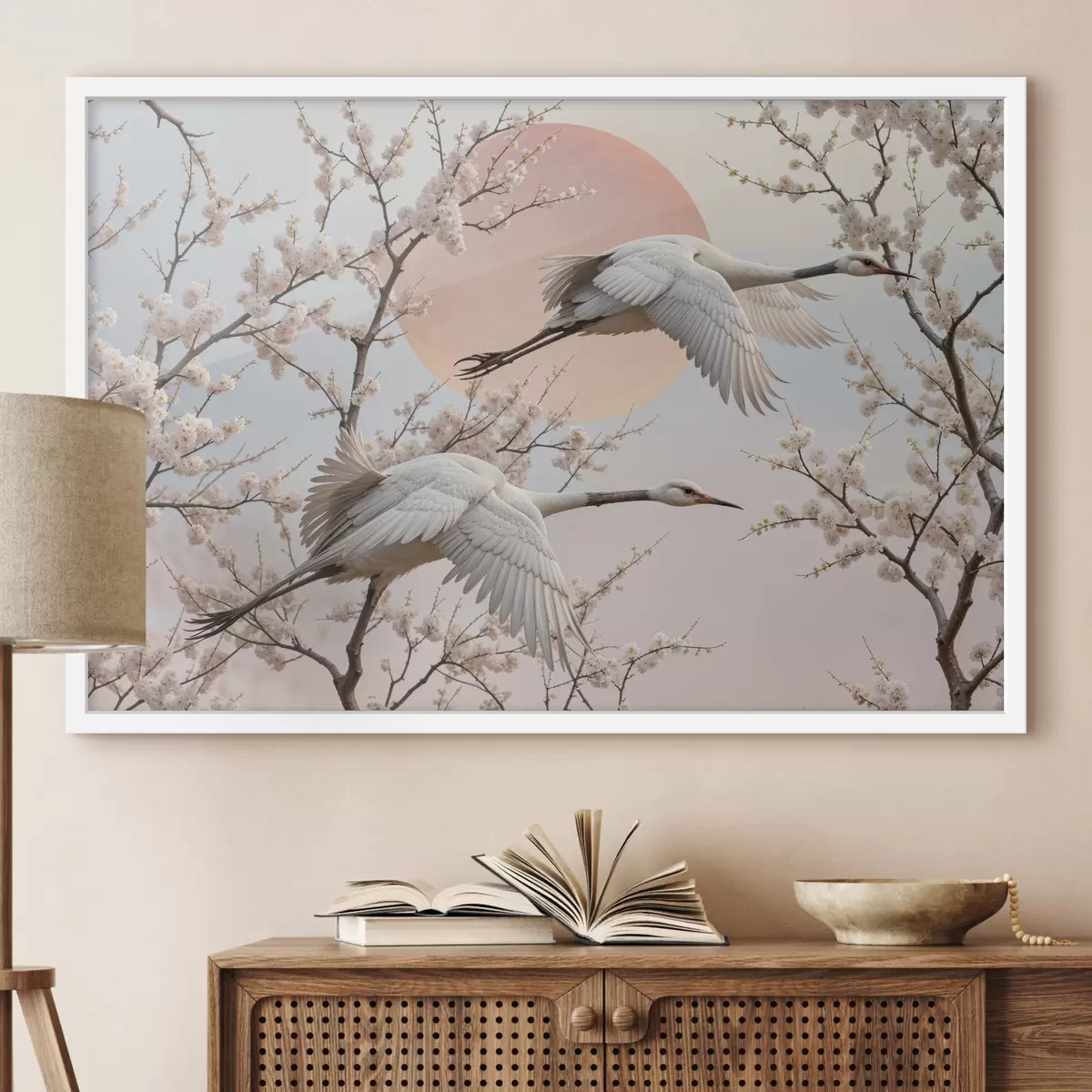 Poster Kaks valget jõhvi lendavad õitsevate kirsiõiepuude vahel roosa päikeseloojangu taeva taustal Nr f40601