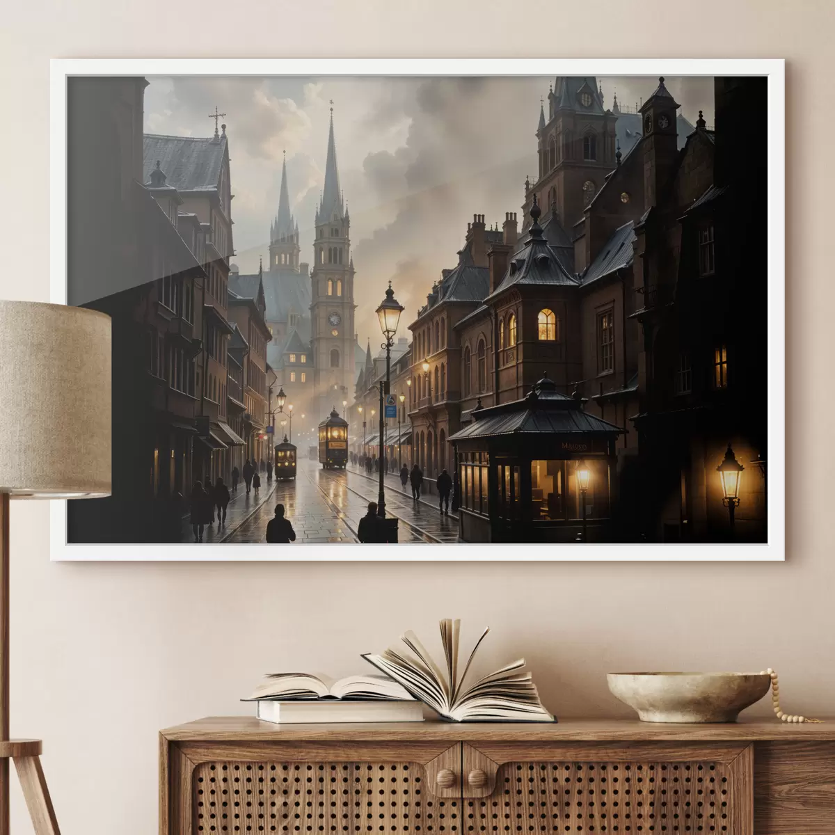 Poster Vihmane õhtu ühes vanas Euroopa linnas, kus on munakivist tänavad, ajaloolised hooned ja mööda sõidab tramm Nr f40604