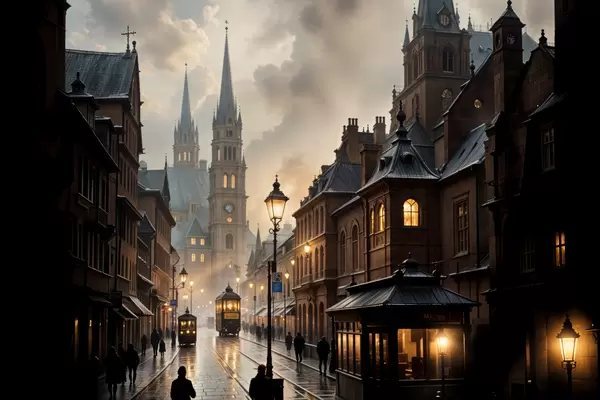 Poster Vihmane õhtu ühes vanas Euroopa linnas, kus on munakivist tänavad, ajaloolised hooned ja mööda sõidab tramm Nr f40604