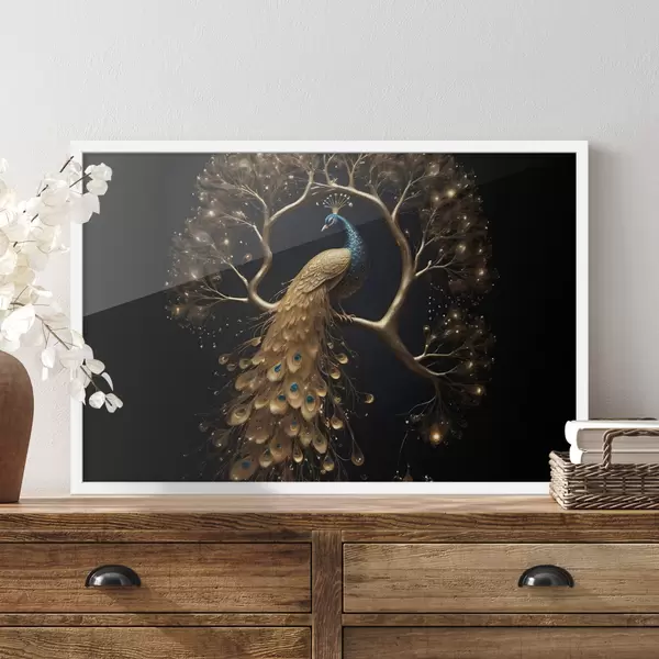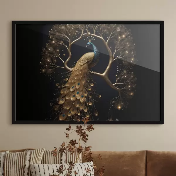 Plakat Elava sulgedega paabulind istub oksal tumedal taustal helendavate puude taustal f40612