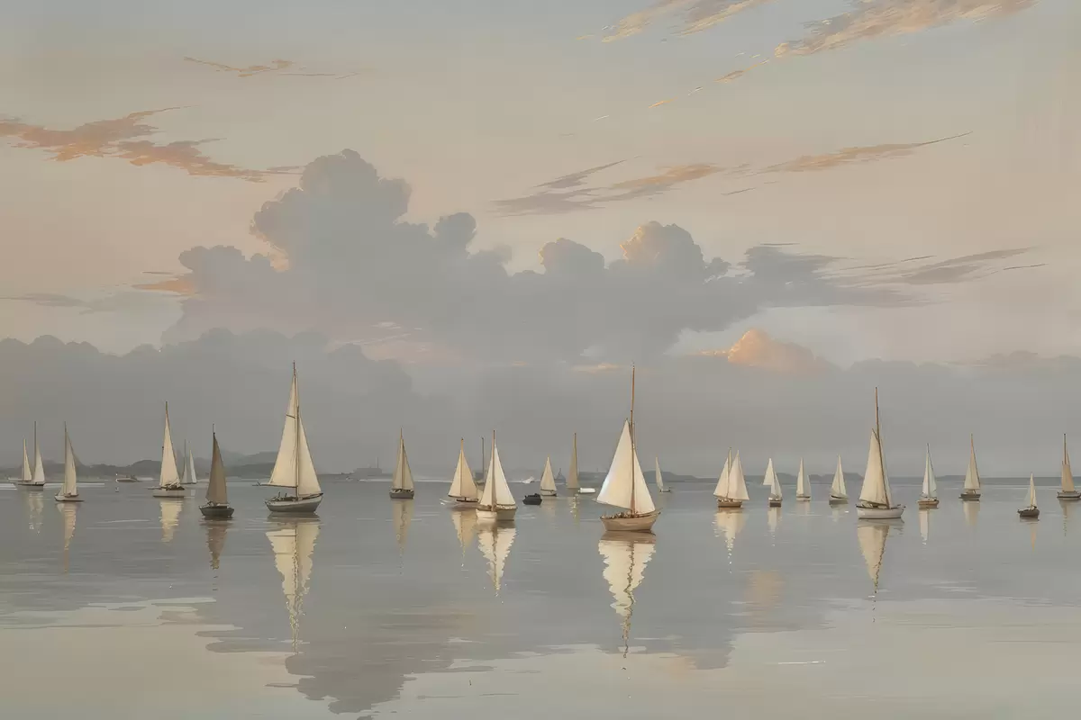 Poster Valge purjekate laevastik rahulikul, peegelduval veekogul päikeseloojangul, taustaks pilvine taevas Nr f40615