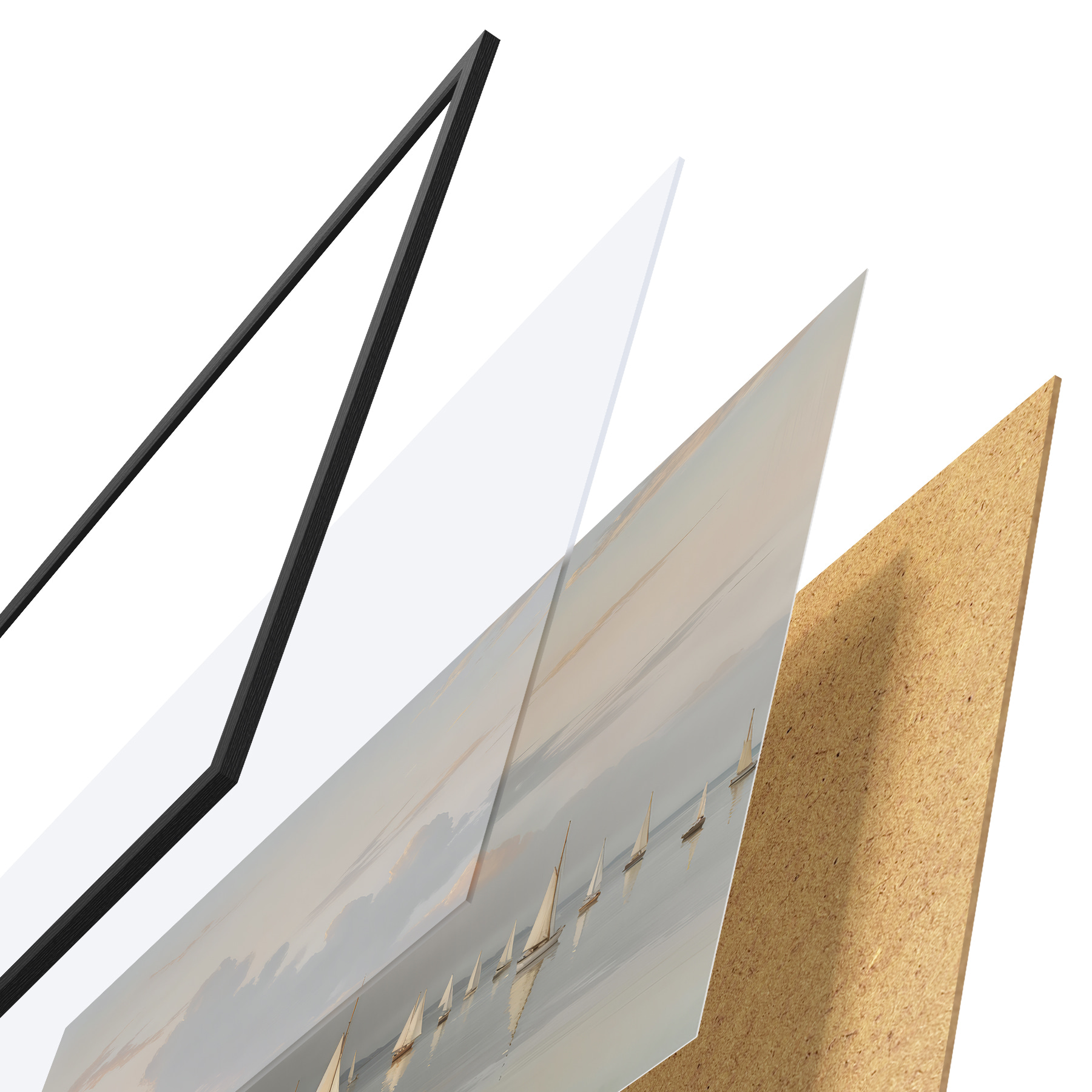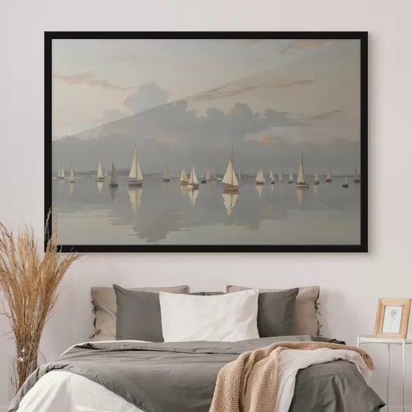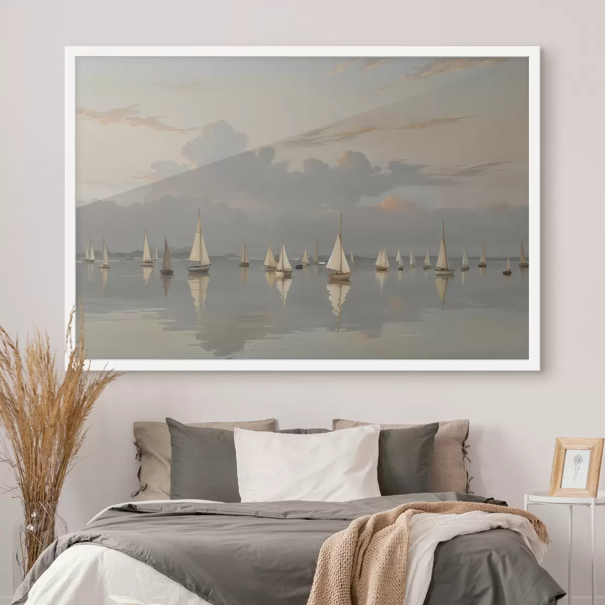 Plakat Valge purjekate laevastik rahulikul, peegelduval veekogul päikeseloojangul, taustaks pilvine taevas f40615