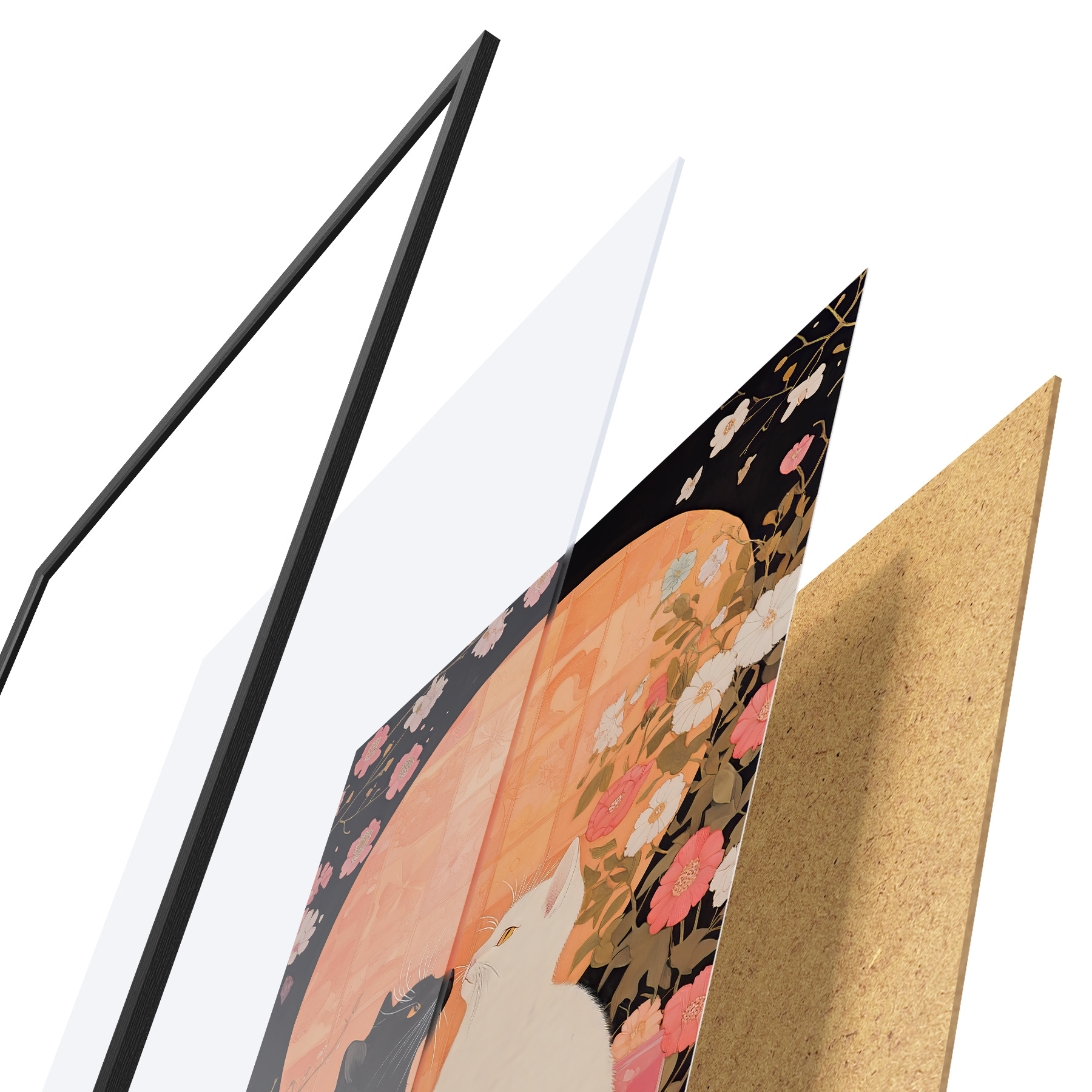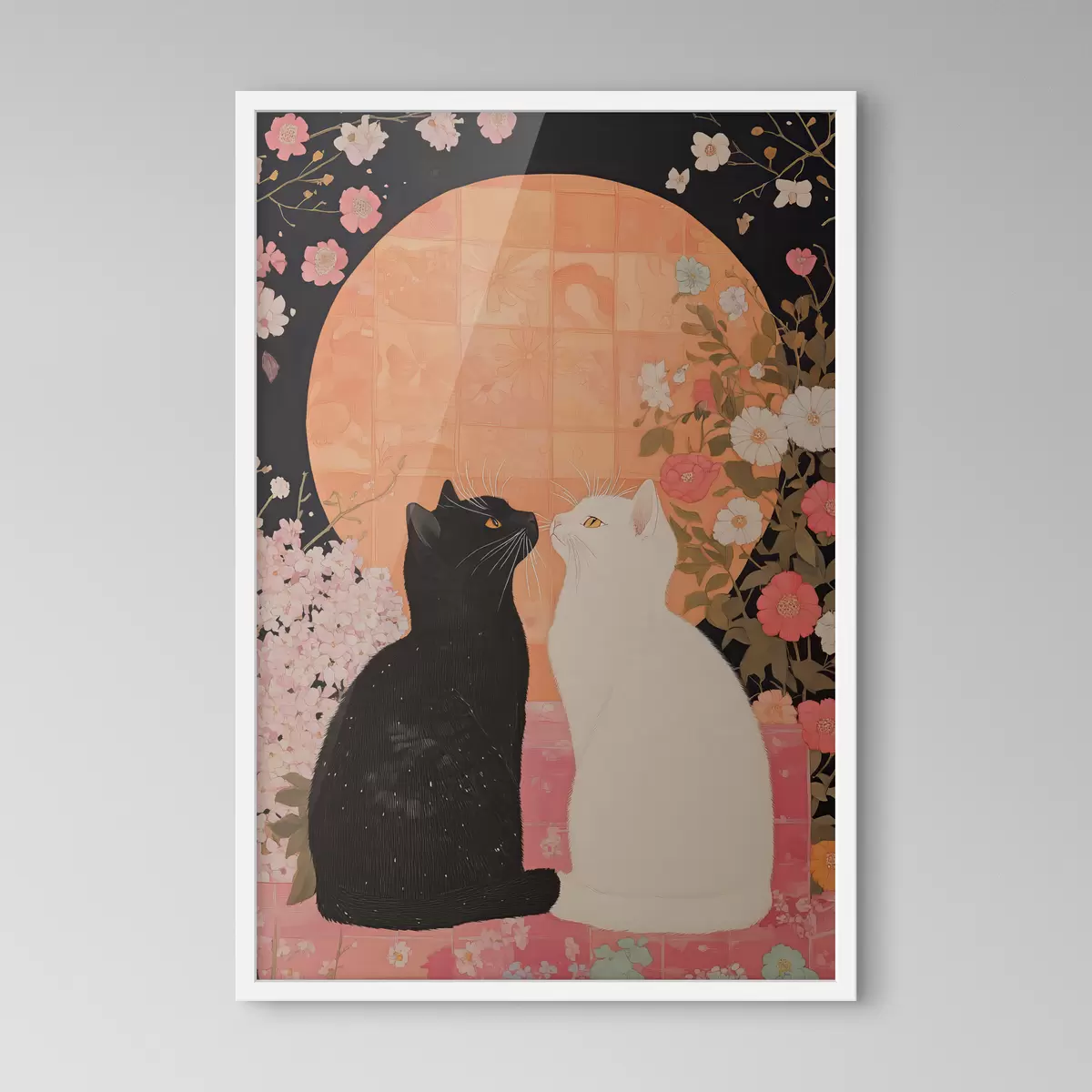 Poster Must ja valge kass vaatavad üksteisele armsalt otsa päikeseloojangul Nr f40669
