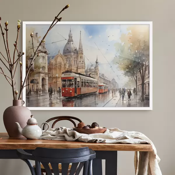 Plakat Punane tramm Viini tänaval akvarellina f40732