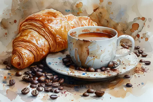 Poster Croissant, hommik, croissant ja tass kohvi, akvarell Nr f40782