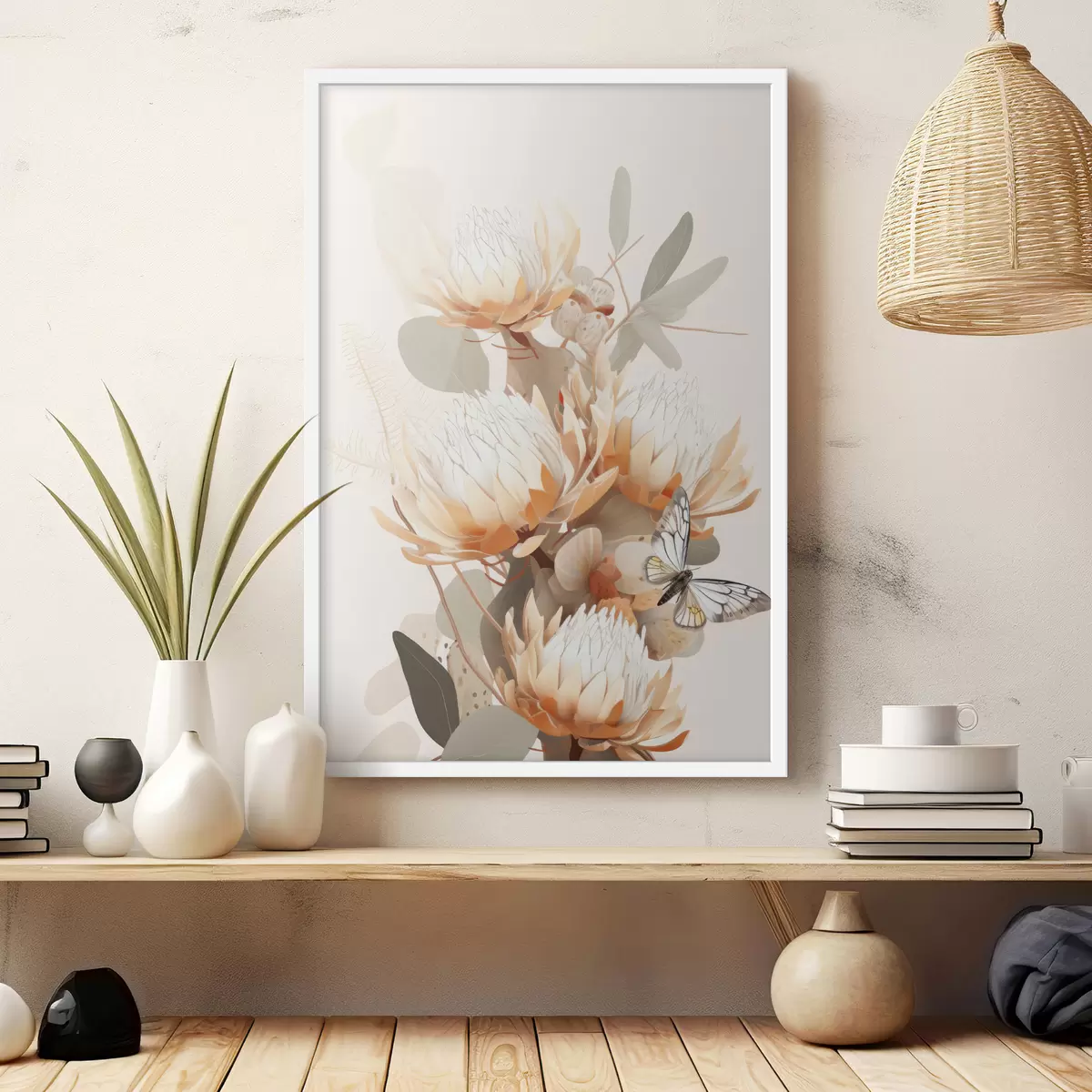 Poster Ilusad protea lilled koos liblikaga, pehmed beežid värvid, puuvillased Nr f40816