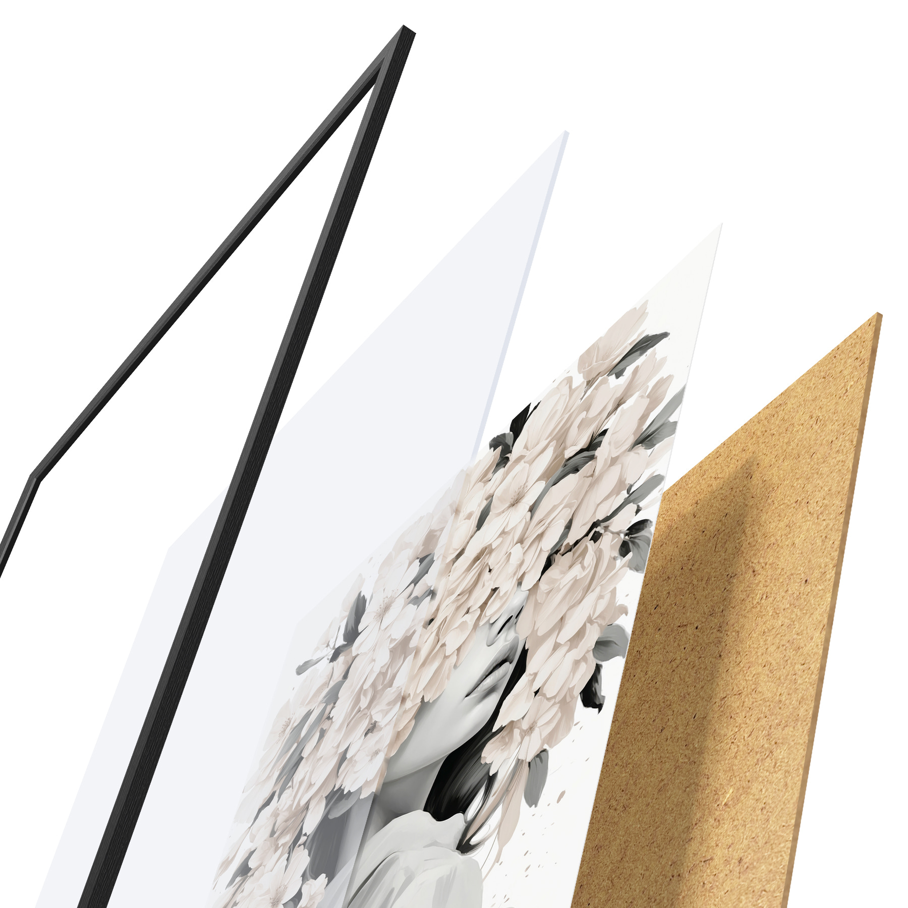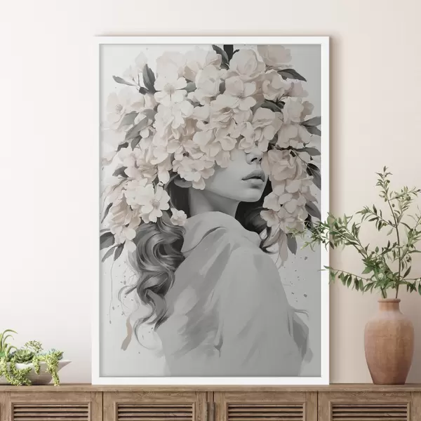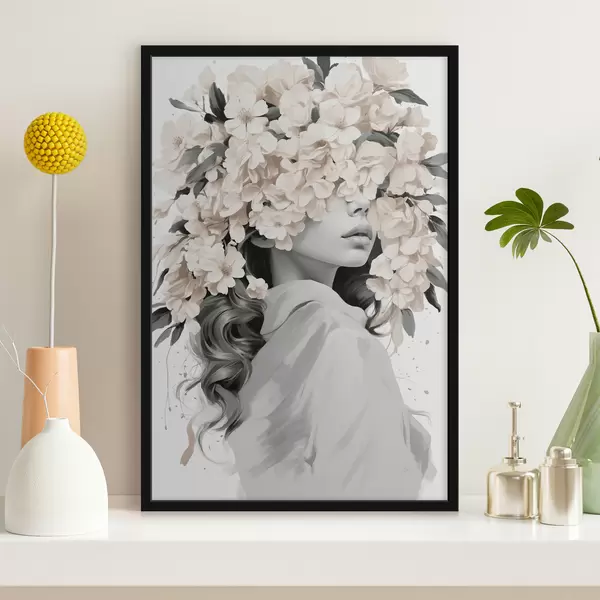 Plakat Tüdruk lilledega tema nägu musta ja valge värvi f40849