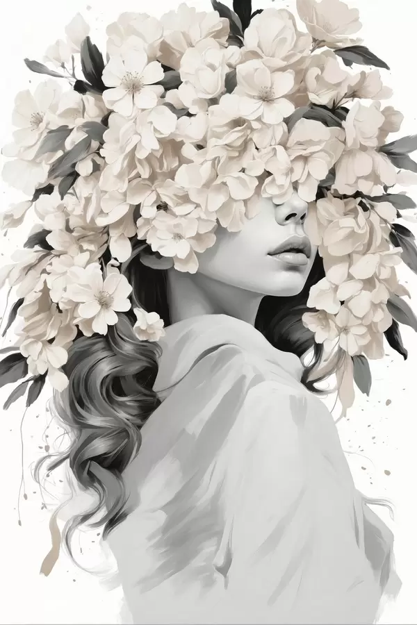 Plakat Tüdruk lilledega tema nägu musta ja valge värvi f40849