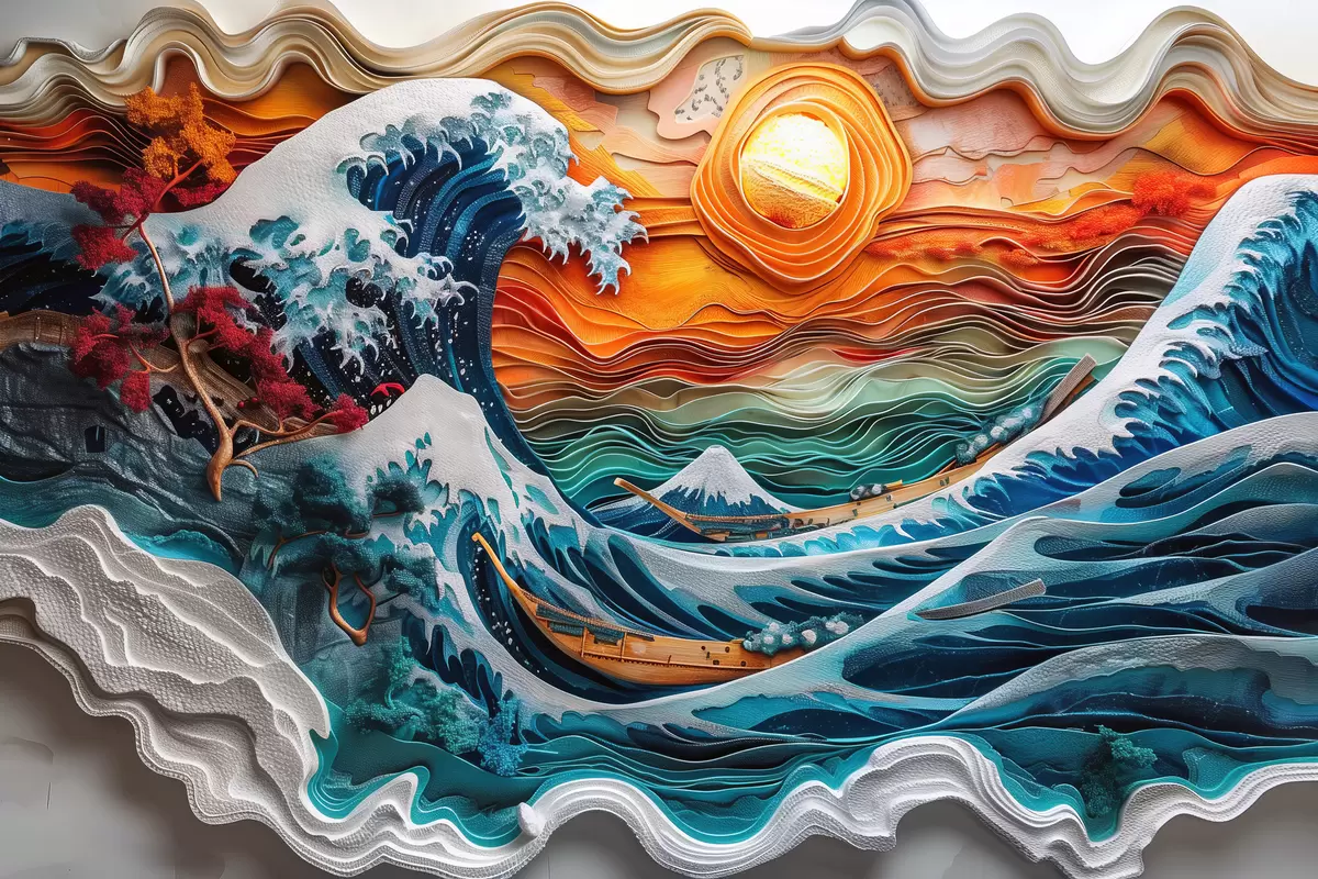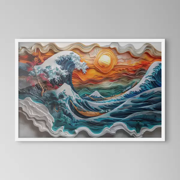 Poster Baisereljeefi imitatsioon: tormiline ookean koos paatide ja päikesega Nr f40976