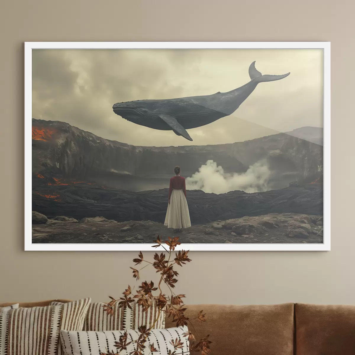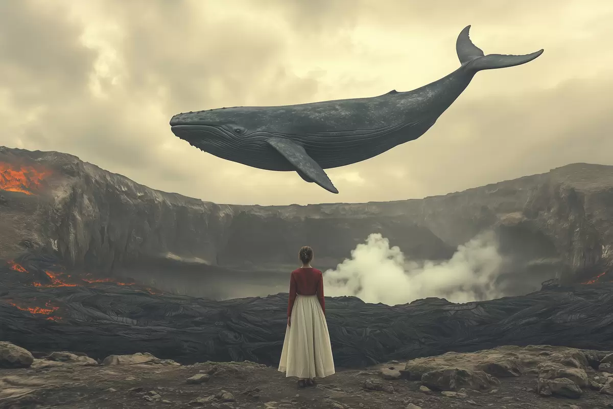 Plakat Tüdruk laava peal koos suure lendava vaalaga taevas f40986