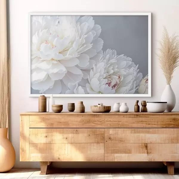 Plakat Valged pehmete, õrnade kroonlehtedega pioonililled helehallil taustal f41085