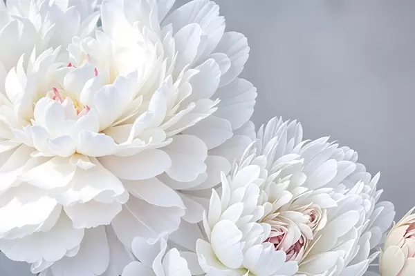 Plakat Valged pehmete, õrnade kroonlehtedega pioonililled helehallil taustal f41085