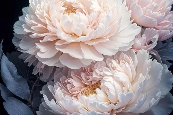 Poster Õrnad pastellroosad pehmete, kohevate kroonlehtedega ja siniste lehtedega õrnad pioonid tumedal taustal Nr f41092