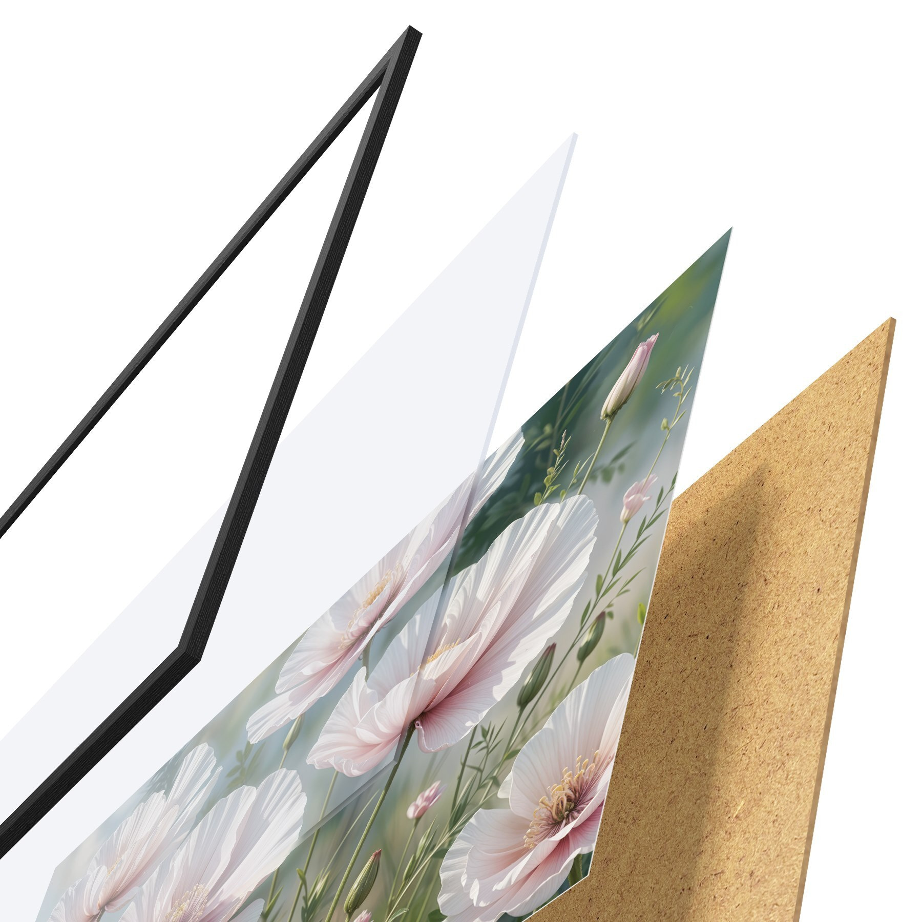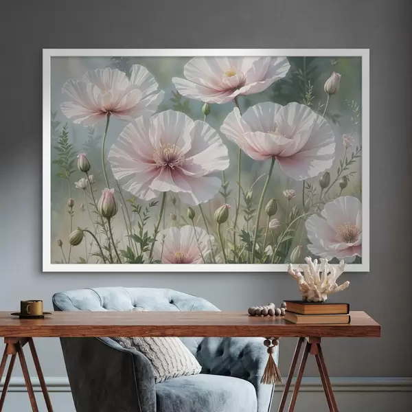 Plakat Õrnade, kahvaturoosade moonilillede põld, mille pehmed, vildakad kroonlehed on hägusel rohelisel taustal f41094