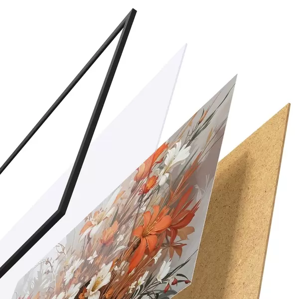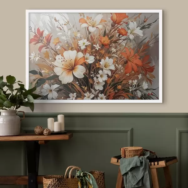 Poster Oranžide ja valgete lillede, sealhulgas liiliate ja muude õrnade õite elujõuline kimp Nr f41099