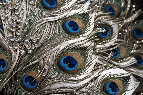 Plakat Elavatest, keeruliste mustritega ja silmatorkavate siniste mustritega paabulinnusulgedest f41103