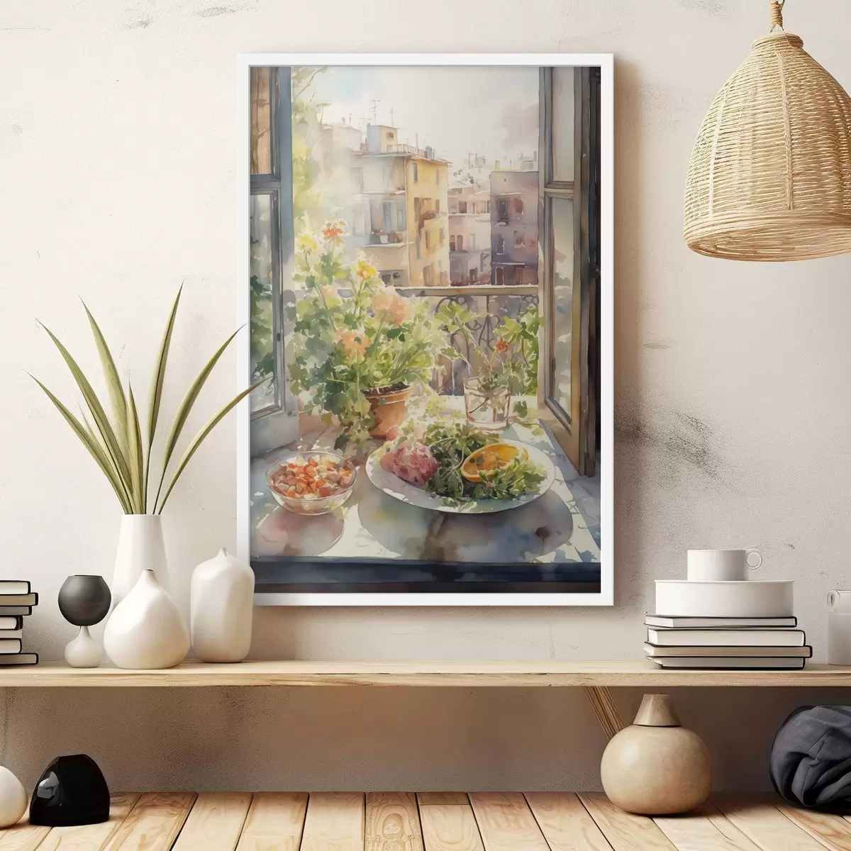 Poster Akvarell õhtusöök, linnavaade, lilled, loodus, roheline salat Nr f41166