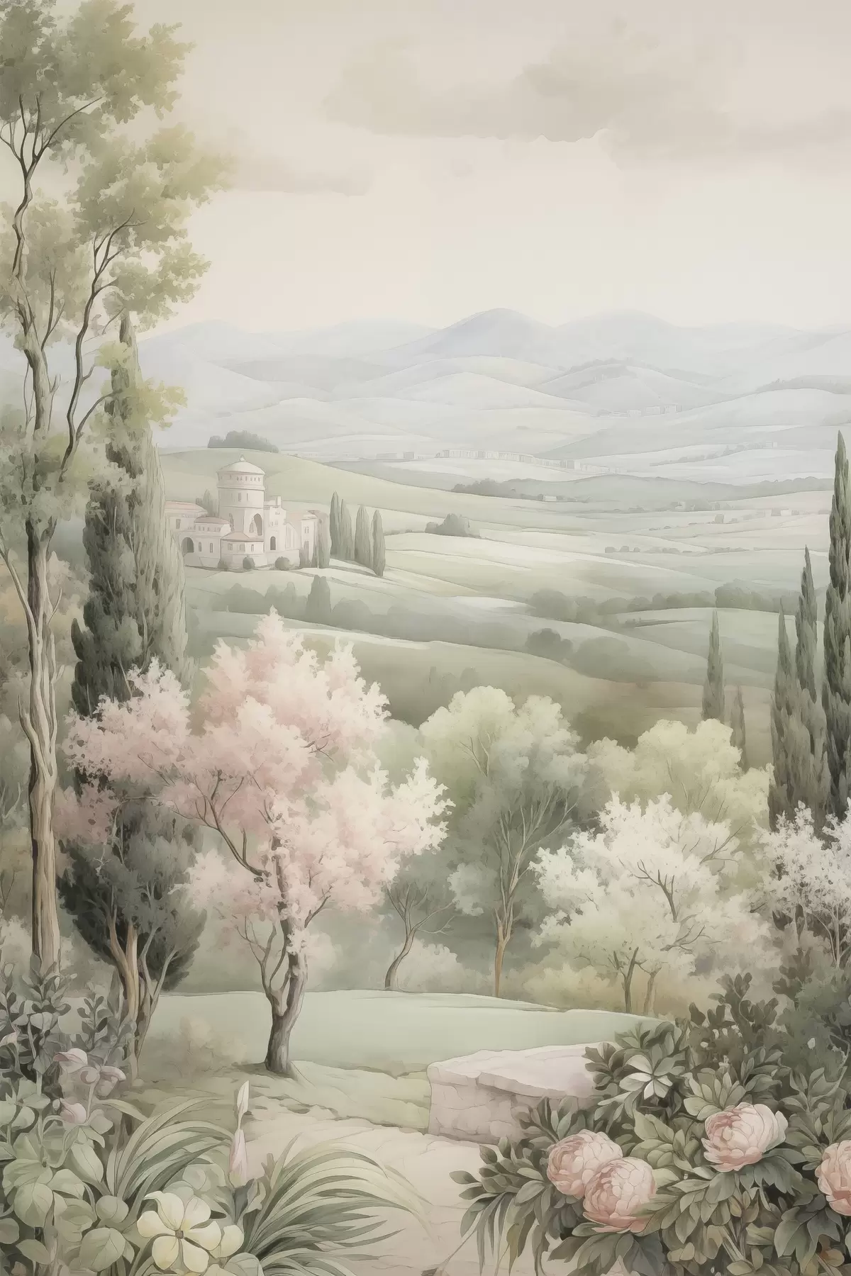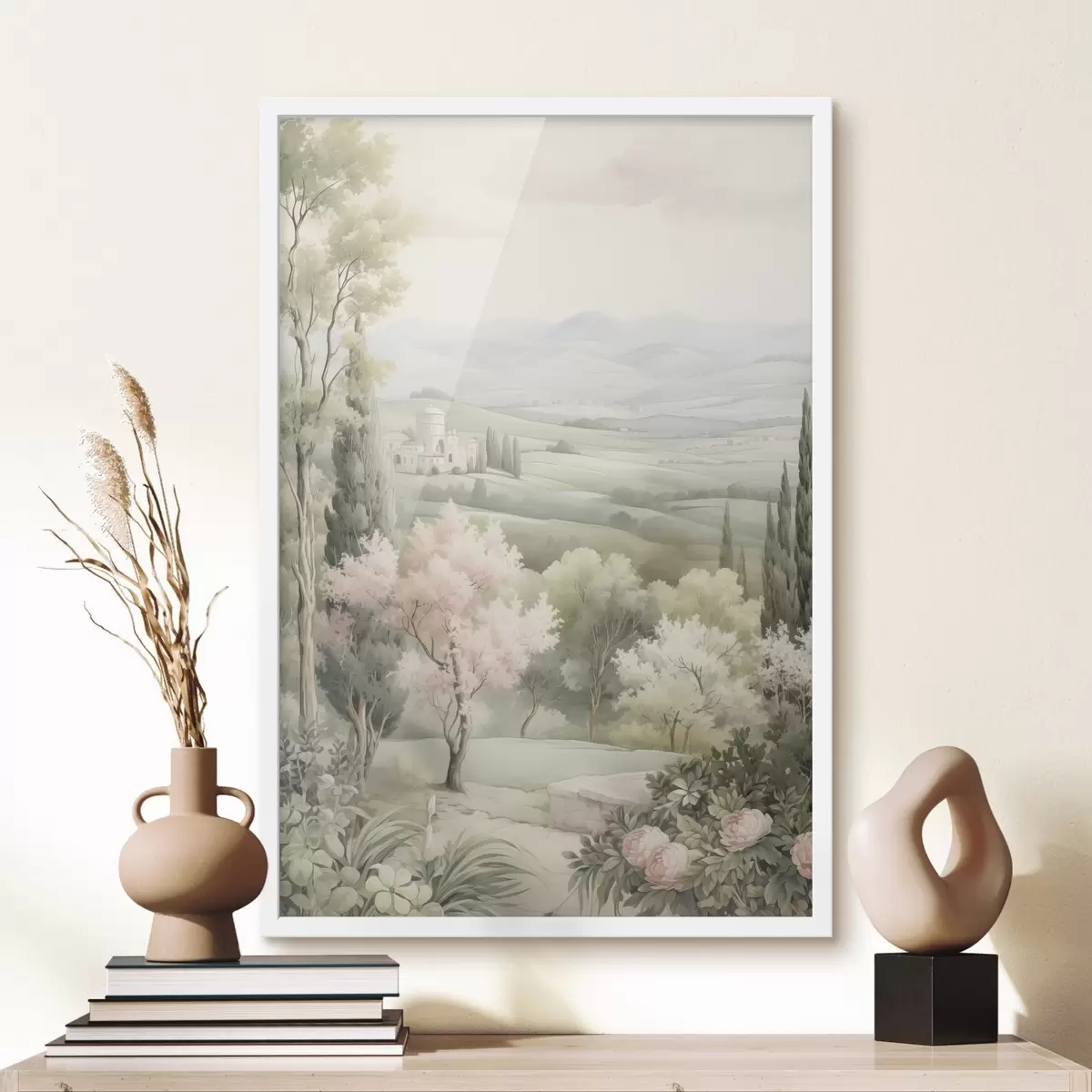 Poster Akvarell loodus, pehmed värvid, roosid, puud, rohelised mäed Nr f41223