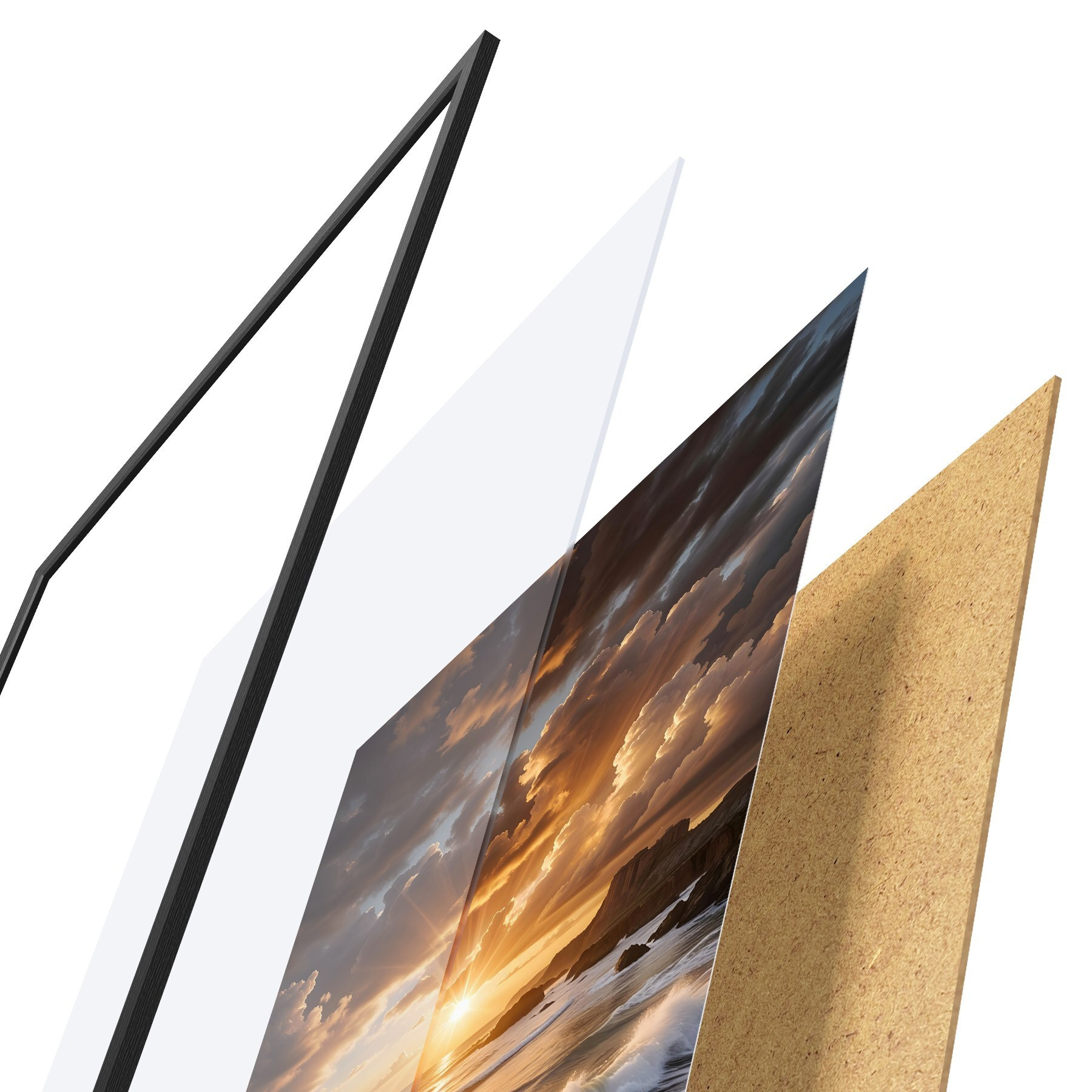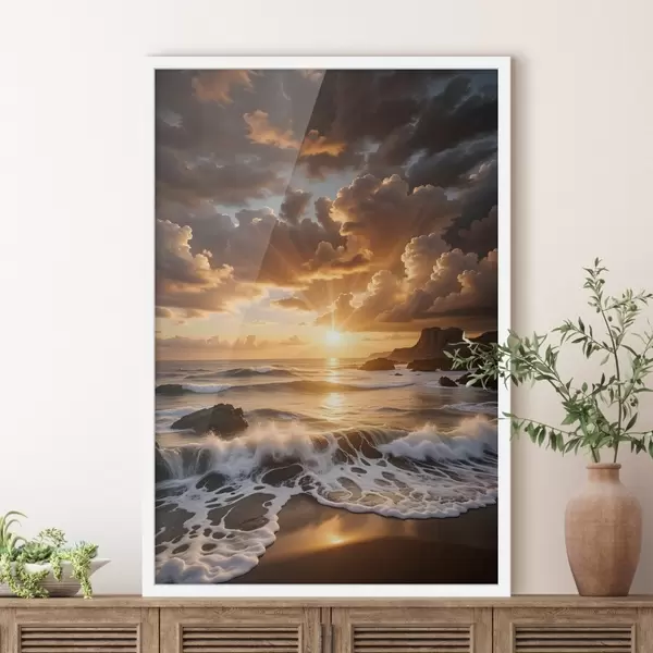 Plakat Dramaatiline päikeseloojang kaljuranniku kohal, lainete mürisemise ja dramaatiliste pilvedega taevas f41245
