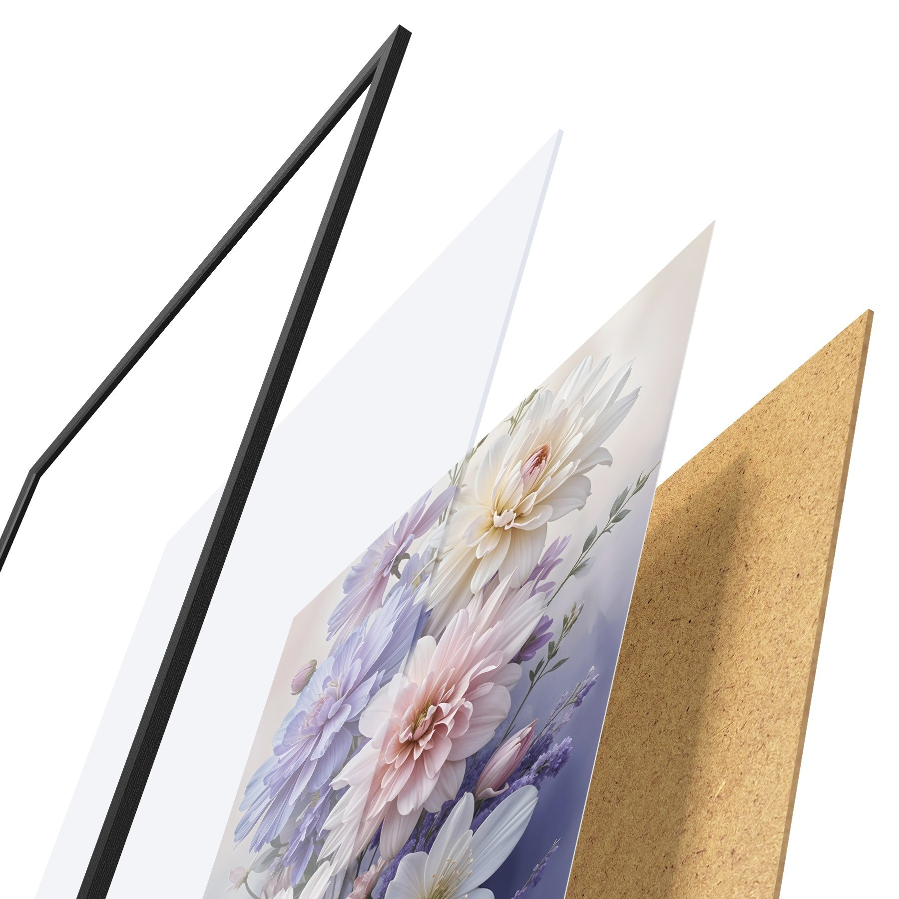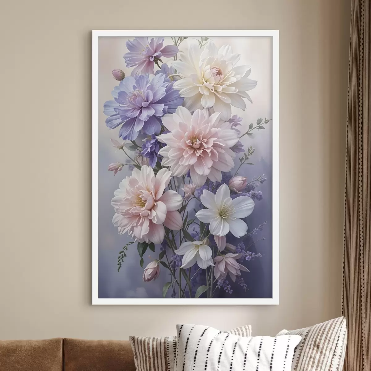 Poster Suurtest, elujõulistest dahlialilledest koosnev kimp roosa, lavendli ja valge toonides pehmel, hägusel taustal Nr f41247