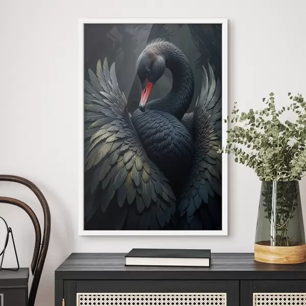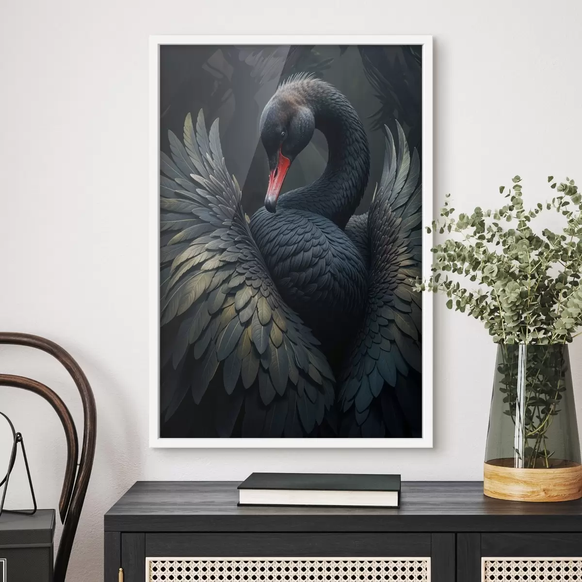 Poster Must luik, kelle tiivad on laiali, näidates oma silmatorkavaid musti sulgi ja punast nokka tumedal taustal Nr f41249