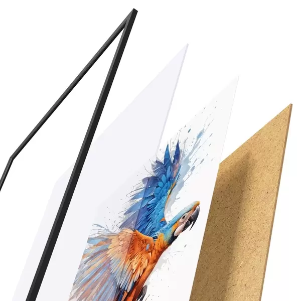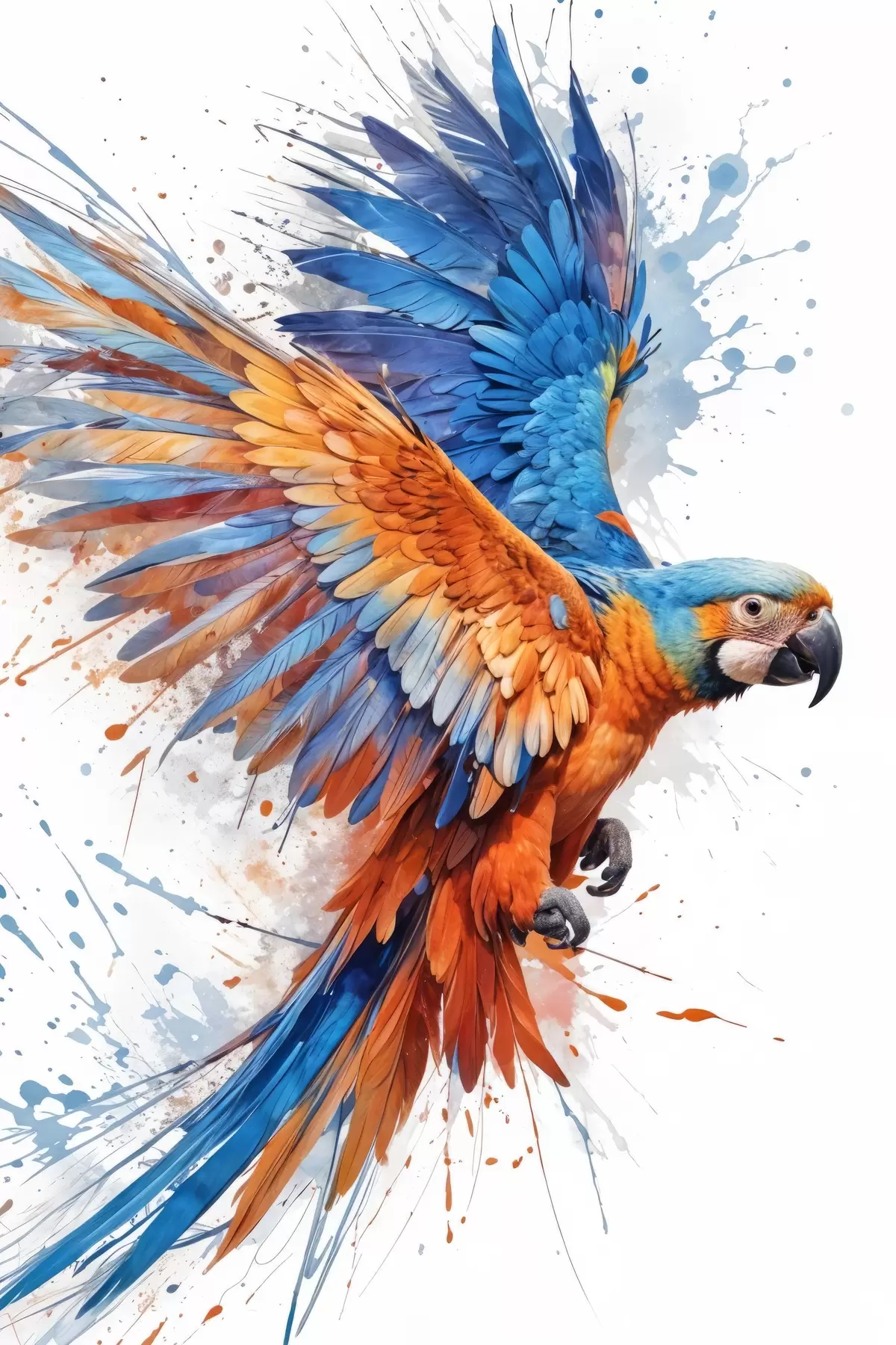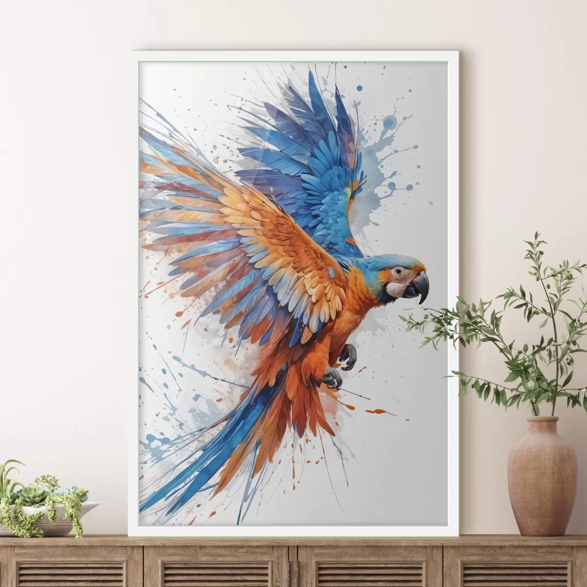 Plakat Värviline papagoi, millel on elava sinise, oranži ja kollase sulestikuga lendu pritsitud taustal f41250