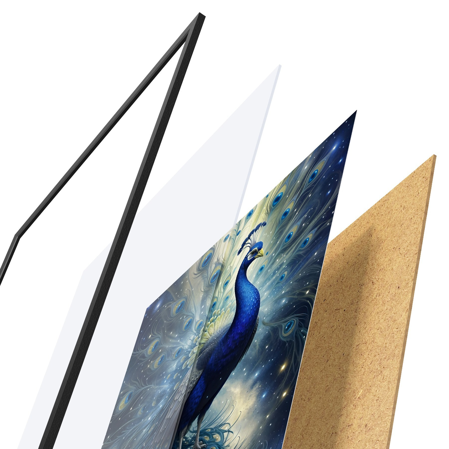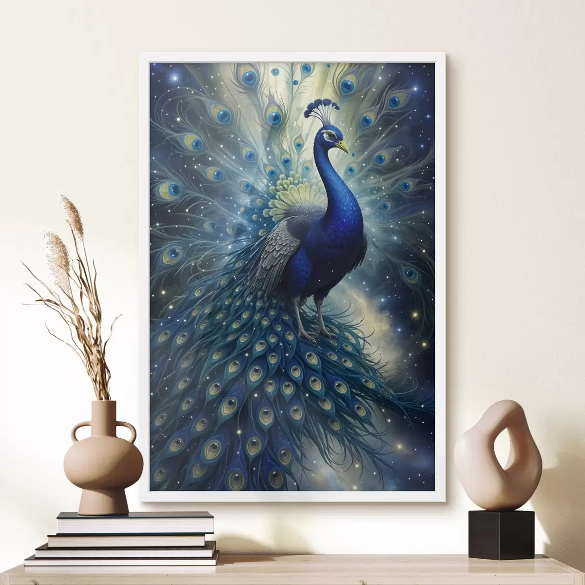 Poster Elav ja majesteetlik paabulind öise tähistaeva taustal, mis loob maagilise ja eeterliku atmosfääri Nr f41256