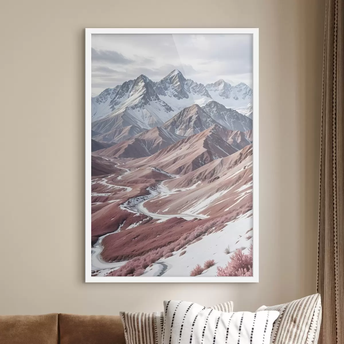 Plakat Karmid lumekattega mäed, mille ääretuid värvilisi maastikke läbib looklev jõgi f41262
