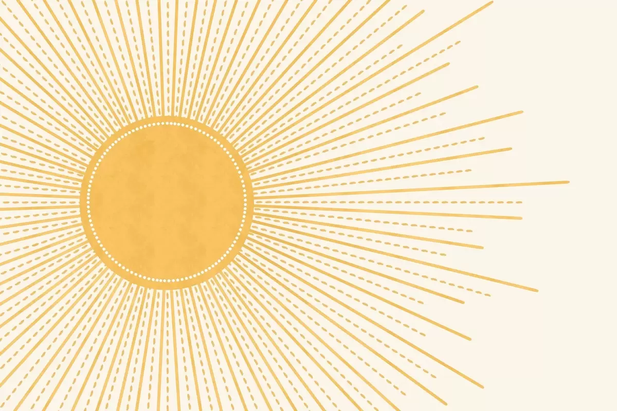 Plakat Helekollane päike koos kiirgavate päikesekiirtega heledal taustal, mis loob sooja ja päikesepaistelise atmosfääri f41268