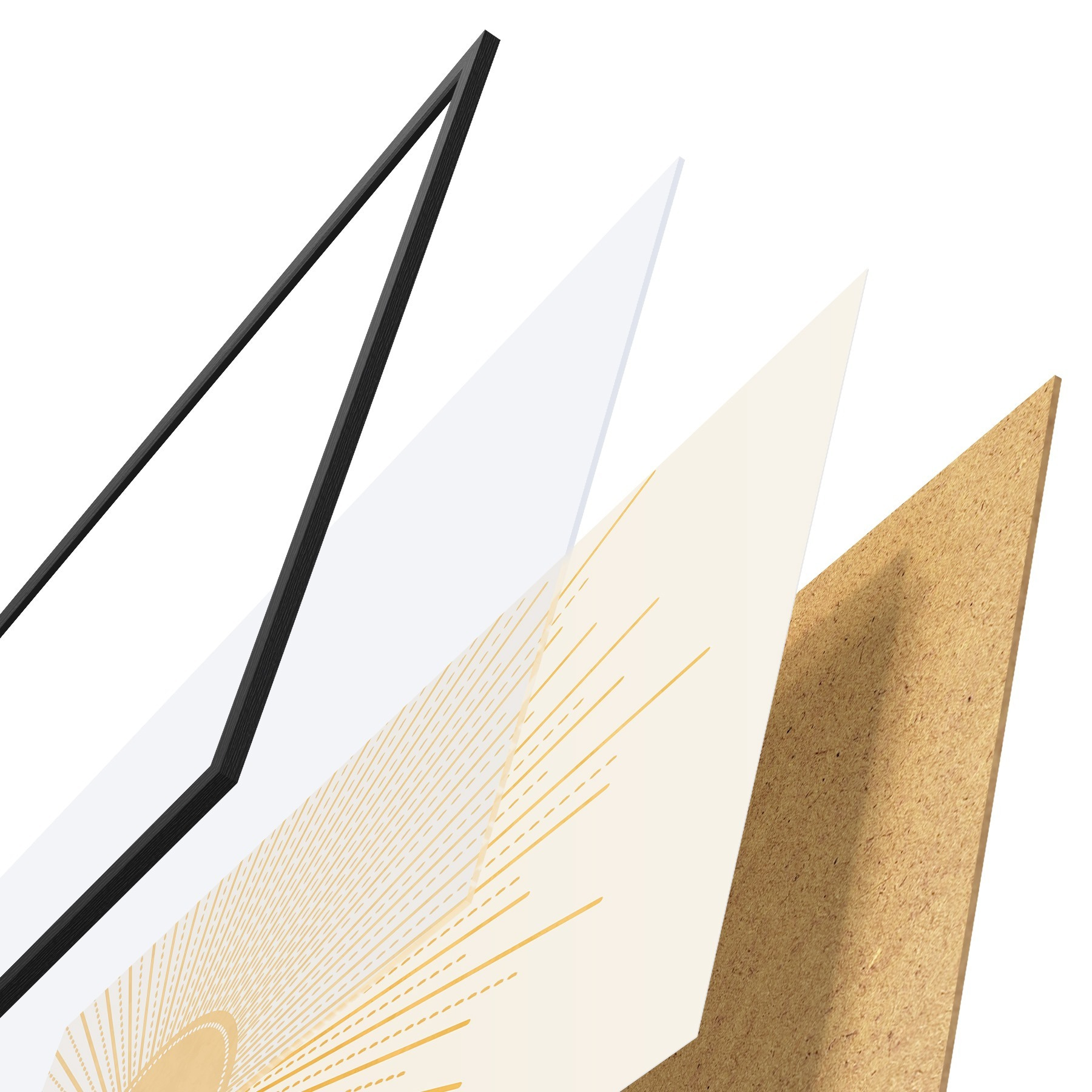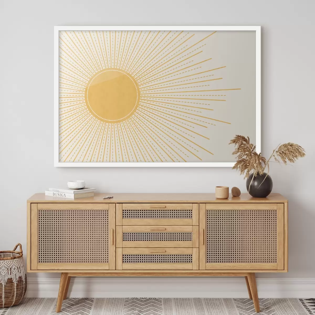 Poster Helekollane päike koos kiirgavate päikesekiirtega heledal taustal, mis loob sooja ja päikesepaistelise atmosfääri Nr f41268