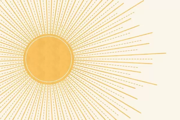 Plakat Helekollane päike koos kiirgavate päikesekiirtega heledal taustal, mis loob sooja ja päikesepaistelise atmosfääri f41268