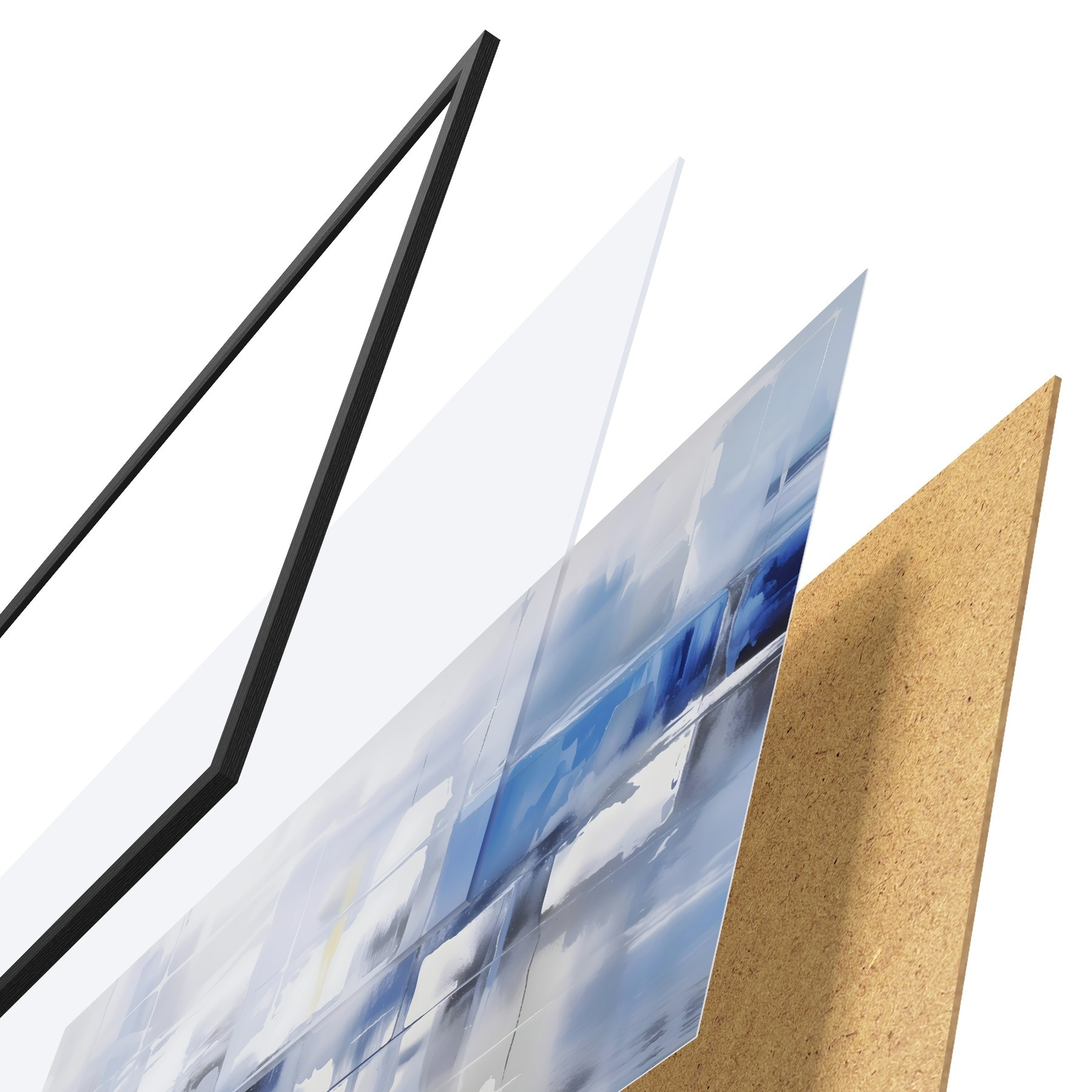 Plakat Moodne abstraktsioon sinise, valge ja halli toonides, häguste joonte ja kujunditega f41269