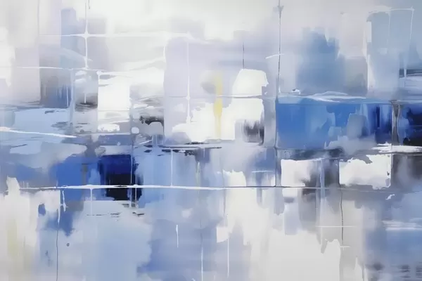Plakat Moodne abstraktsioon sinise, valge ja halli toonides, häguste joonte ja kujunditega f41269