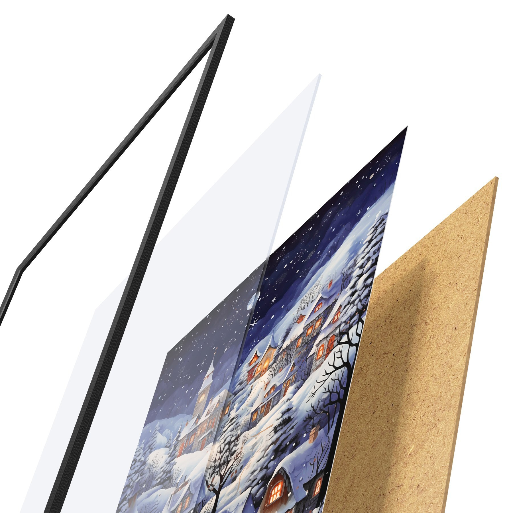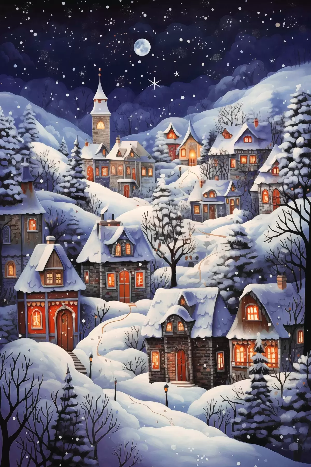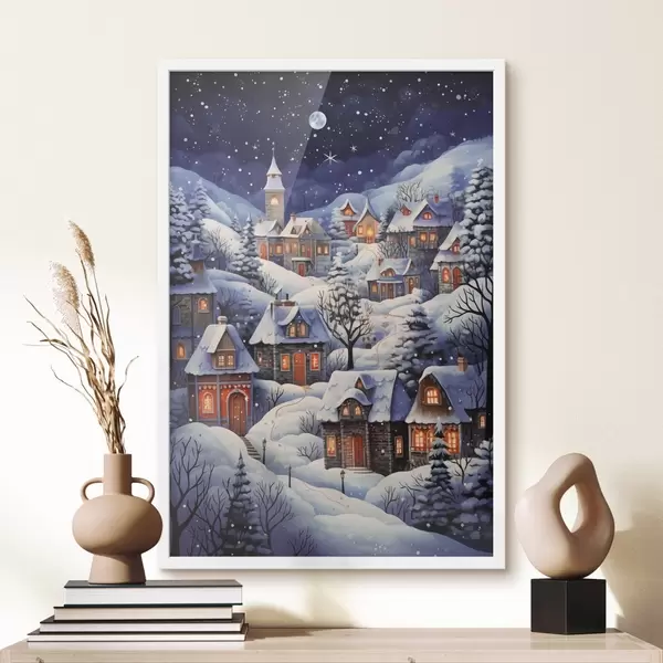Poster Talvine maastik lumega kaetud maakodudega öise tähistaeva taustal Nr f41275