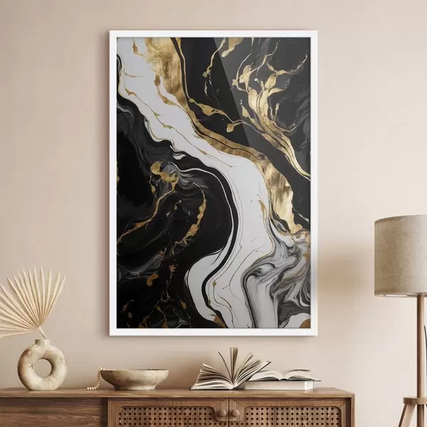 Poster Must-valge abstraktne värvimine kollaste laikudega Nr f41292