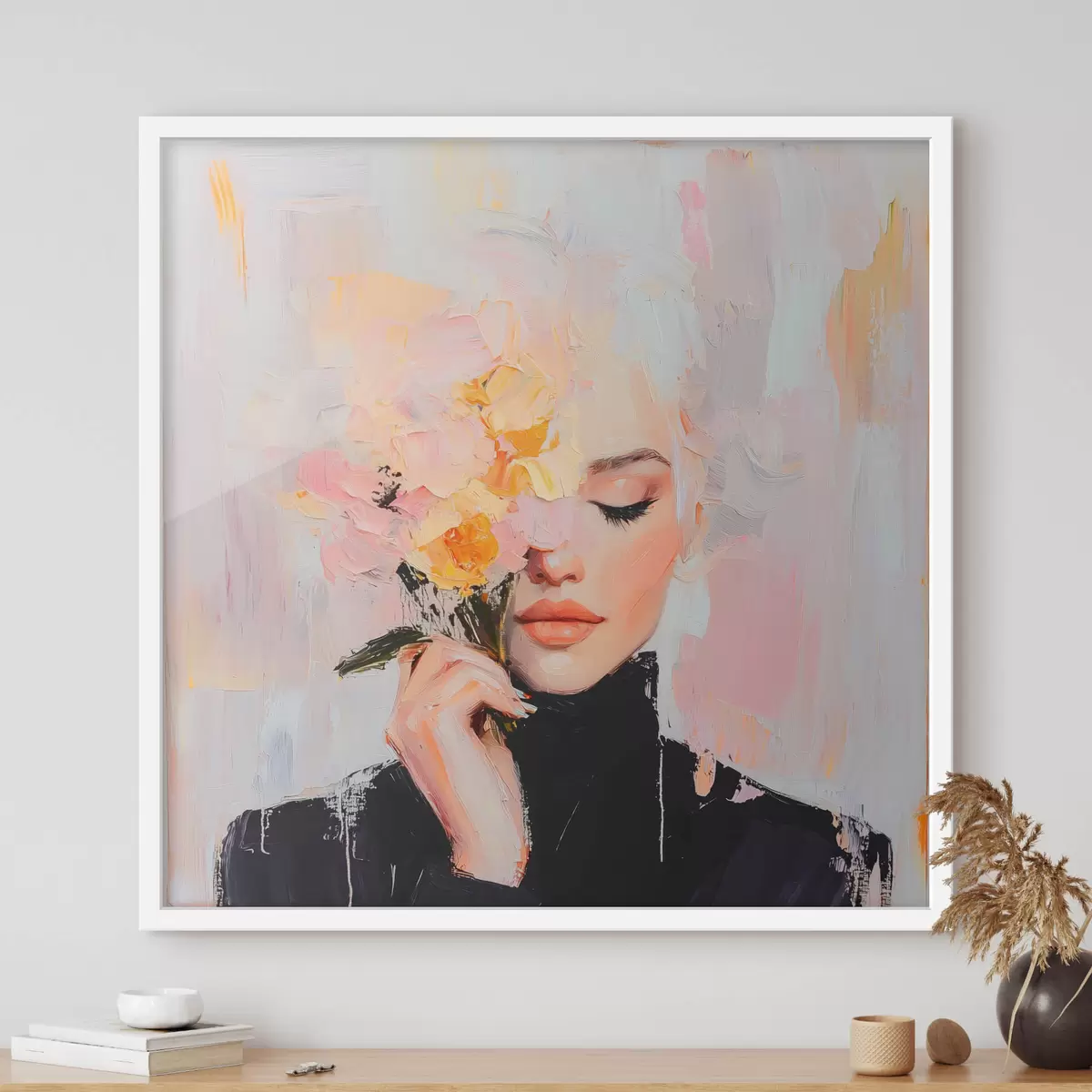 Plakat Abstraktne naine lillekimbuga kätes, pintslitõmbedega f41355