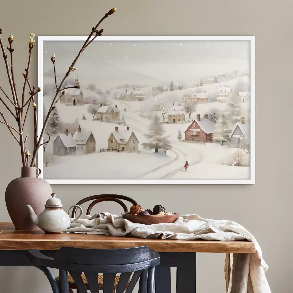 Plakat Talveküla, akvarell, lumehelbed, pehmed värvid, puud, maastik f41381