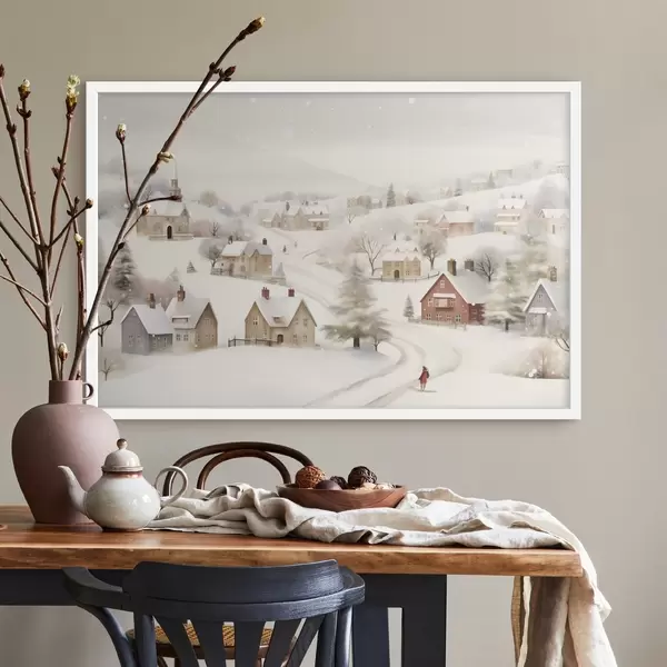 Poster Talveküla, akvarell, lumehelbed, pehmed värvid, puud, maastik Nr f41381
