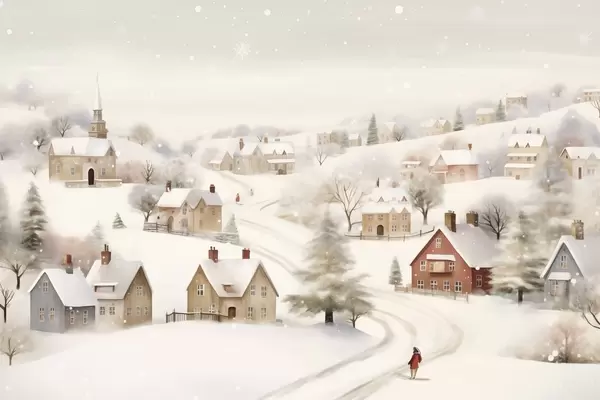 Plakat Talveküla, akvarell, lumehelbed, pehmed värvid, puud, maastik f41381