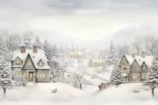 Poster Kaunis talvine maastik küla, mändide, majade, mägedega Nr f41384