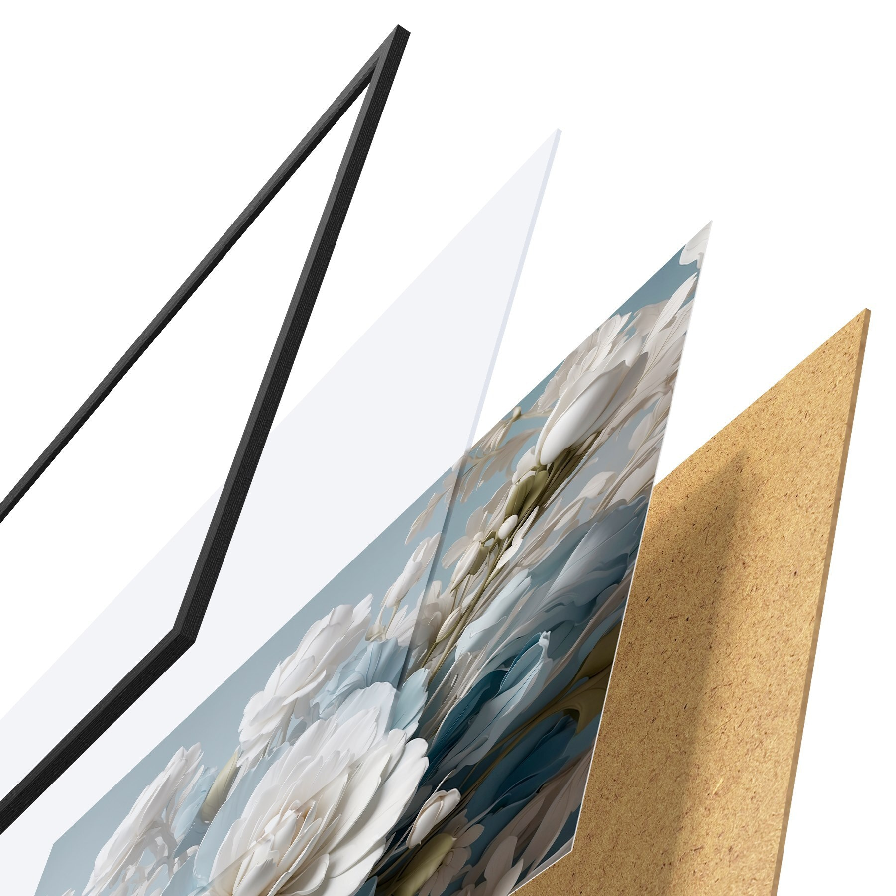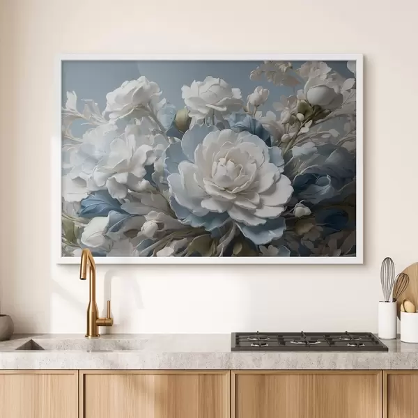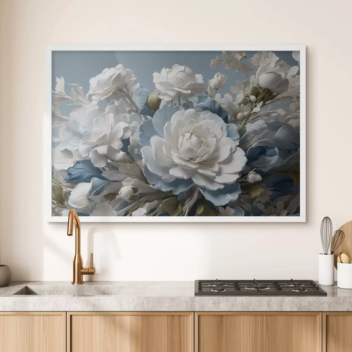 Plakat Valged lilled ja lehed sinisel taustal f41527
