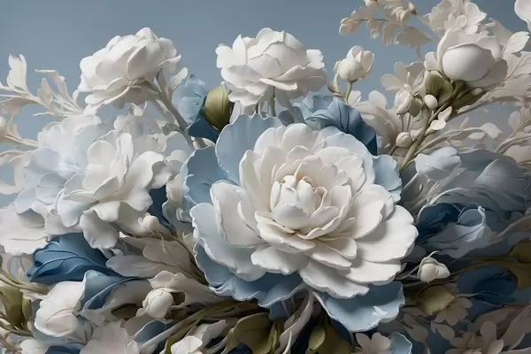 Plakat Valged lilled ja lehed sinisel taustal f41527