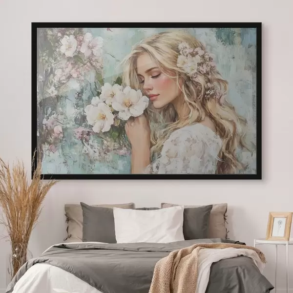 Plakat tüdruk lillede lähedal õlivärvidega f41632
