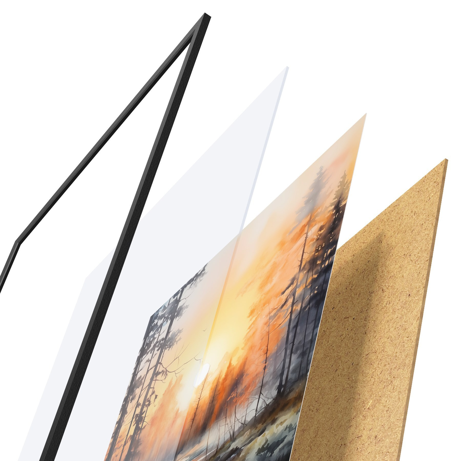 Poster Järv metsas, akvarell, sügisvärvid, udu, päikeseloojangu taevas Nr f41642