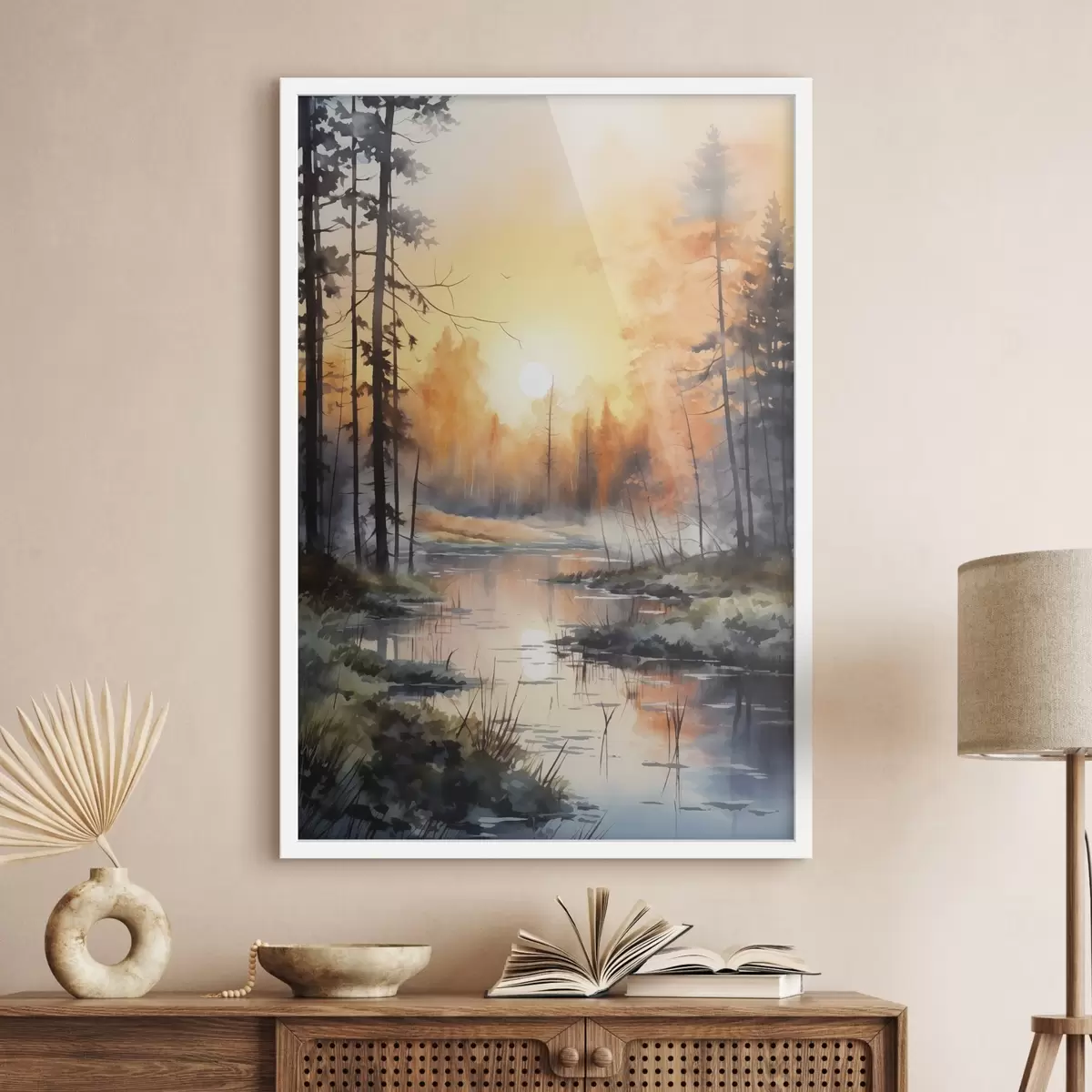 Plakat Järv metsas, akvarell, sügisvärvid, udu, päikeseloojangu taevas f41642
