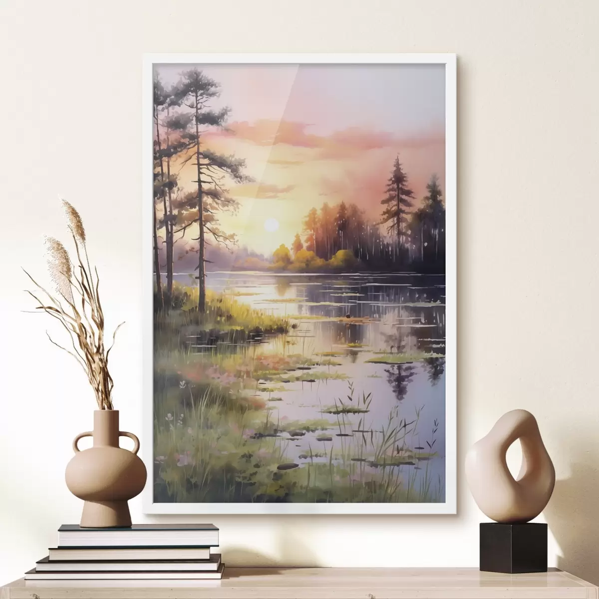 Plakat Päikesetõus metsajärvel, akvarell, puud, lilled, õrn valgus f41644