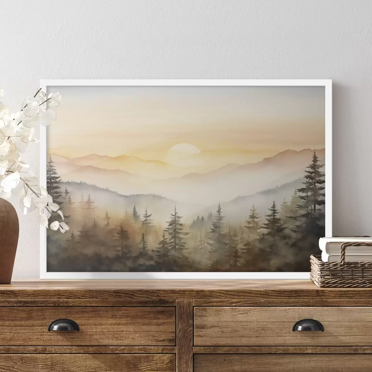 Plakat Sügisene mägimaastik, männimets, päikeseloojang, akvarell f41645
