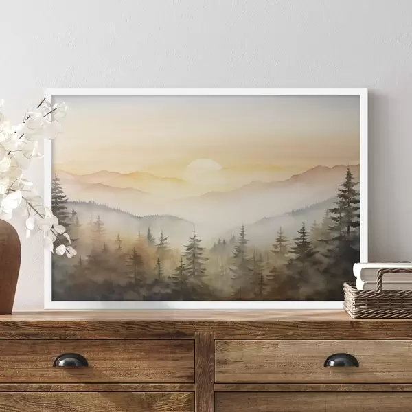 Poster Sügisene mägimaastik, männimets, päikeseloojang, akvarell Nr f41645
